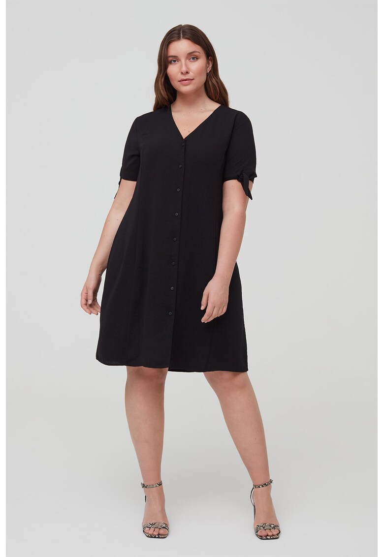 Caracteristici Culoare: negru Stil: casual Material: poliester Imprimeu: uni Croiala: evazat Lungime: midi Decolteu: in v Maneci: cu benzi innodate Lungime maneca: maneca scurta Sistem inchidere: nasturi Compozitie Exterior: 100% poliester